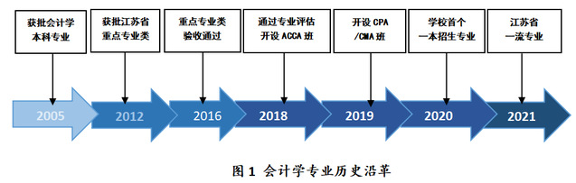 1983年开设会计学专科,2005年获批本科。2012年获批以会计学为核心的江苏省本科工商管理类重点专业,2021年获批江苏省一流专业。经过长期积累,发挥引领作用,为建设一流专业奠定坚实基础。