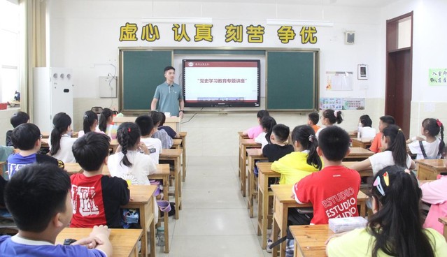 此次党史宣讲活动的授课对象是小学生,青年讲师们精心准备,运用通俗易懂却引入深思、幽默风趣但又不失严谨的语言来吸引小听众。宣讲从中国共产党成立的背景谈到杰出党员的代表人物,向同学们细数了中国共产党百年来所取得的一项项辉煌成就。最后结合当今中国的繁荣面貌,展望未来,对祖国的花朵提出期许。讲师团授课深入浅出,循循善诱,让现场每一位少先队员接受了一场思想的洗礼,感悟红色魅力,厚植信仰根基,让他们在新时代的康庄大道上坚定理想信念,励志以成才,以我辈当自强为己任。在场的小听众神情专注,认真思索,稚嫩的一张张小脸上写满了对英雄人物的敬佩与感激。在青年讲师与孩子们的一问一答、一思一悟之间,孩子们对中国共产党的百年历史、党的伟大精神有了进一步的认识,爱党、爱国的种子播撒在了孩子们心间。
