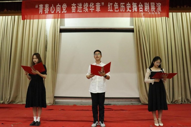 紧接着是诗朗诵《信念永恒》。同学们用自己的抑扬顿挫的声音将中国共产党一百年的风雨历程展现在观众面前:从上海望志路到南湖的红船,从秋收的长沙城到星火燎原的井冈山,从江西的瑞金到陕北的延安。观众们从朗颂声中的深切感受到了无数仁人志士为了新中国的诞生前仆后继,不畏牺牲的共产主义精神。