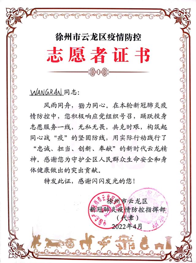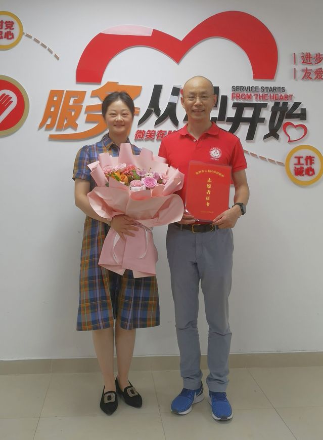 日前,我院新引进的澳大利亚籍教师王然博士应邀参加大龙湖学苑社区志愿者表彰仪式,获得颁发“徐州市云龙区疫情防控志愿者证书”,云龙区卫健委党委书记、副主任郭爱君向王然博士表示祝贺并予以感谢。