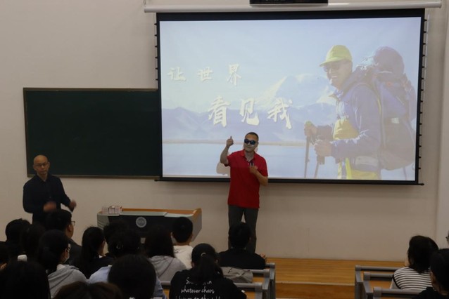曹晟康先生以独特的演讲风格和澎湃饱满的激情,结合自身经历,与同学们分享8岁时因意外双目失明,从心灰意冷到重拾信心,以一根盲杖,游历三十八个国家,走遍世界六大洲,登顶非洲最高峰乞力马扎罗山的传奇经历。“如果我不能看见世界,那就让世界看见我”。曹晟康先生用自己的故事,鼓励同学们面对挫折不妥协、不服输,乐观面对生活,坚定追求梦想。