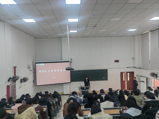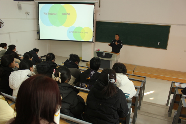 王警官针对学生群体特点,结合近期发生的诈骗真实案例“以案说法”,深入分析网络诈骗的特点、类型、手段和危害,通过通俗易懂的案例向学生讲解了常见的网络诈骗种类,着重讲解冒充熟人、冒充客服、校园贷、网上游戏账号虚假交易、网上兼职刷单等诈骗手段,以及不法分子如何利用人们的心理弱点进行诈骗,让学生们深刻认识到电信网络诈骗行为的危害性和防范的重要性。